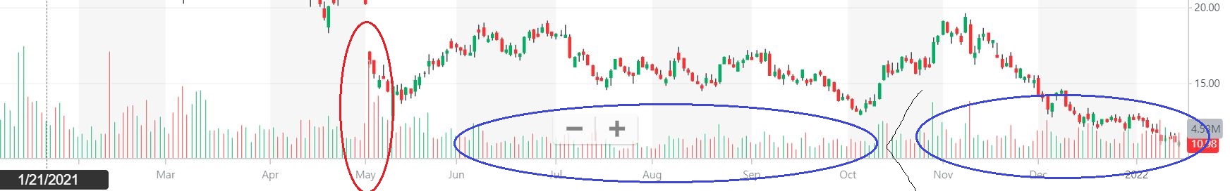 거래량은 2021년 중반보다 말부터 거래량이 조금씩 증가하는 것을 볼 수 있다. 누군가의 관심이 늘고 힘이 생기고 있다는 것인데 but 거래량과 함께 주가가 계속 떨어지는 것은 나쁜 신호로 볼 수 있다. '이건 미래가 없어'라고 생각하며 투자자들이 일제히 나가고 있을 수도 있기 때문이다.